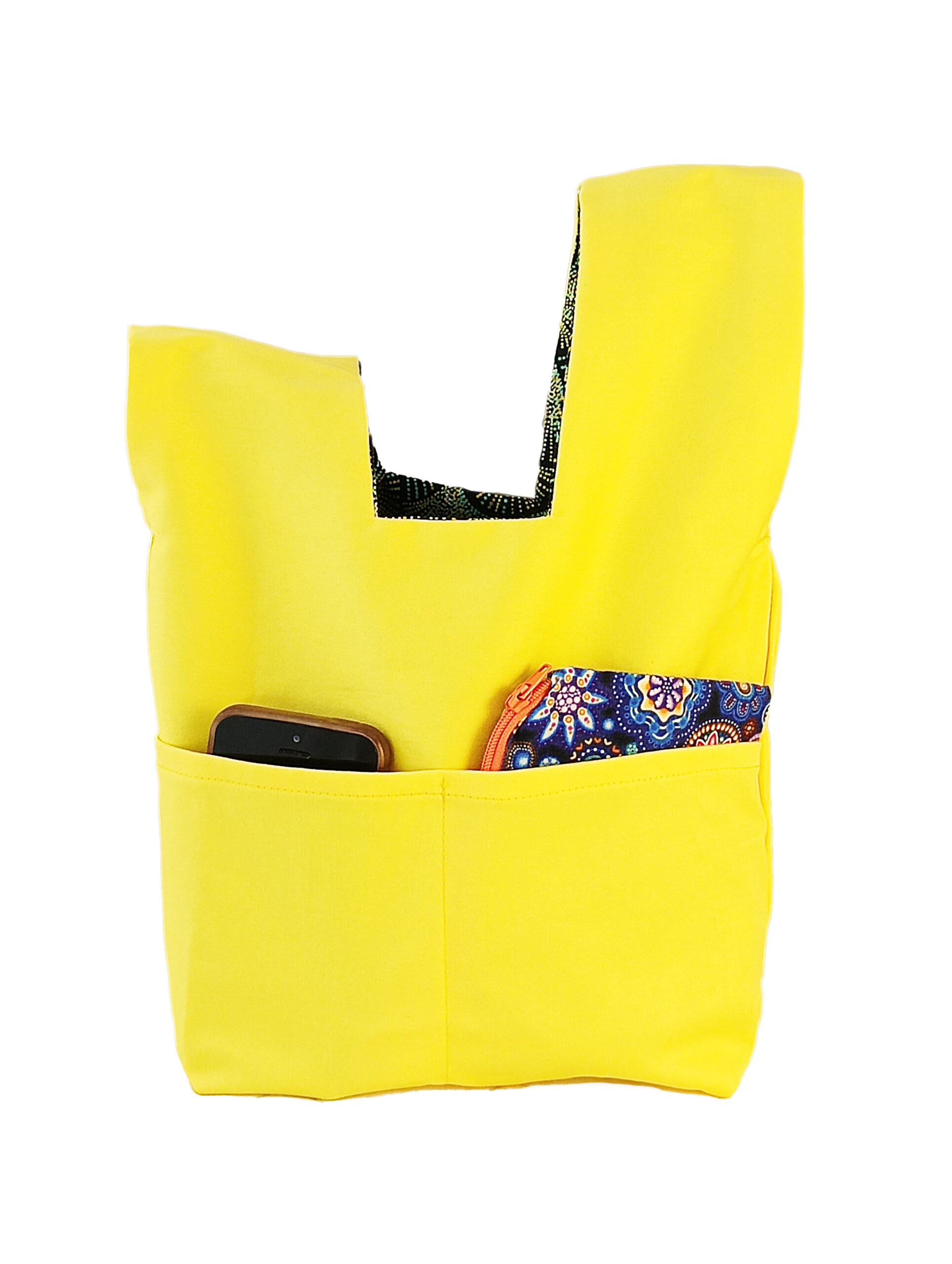Ce knot bag à deux poches intérieures. Tissus intérieur et extérieur : 100% coton. Dimension : 35×25 cm. Fabrication française et artisanale.